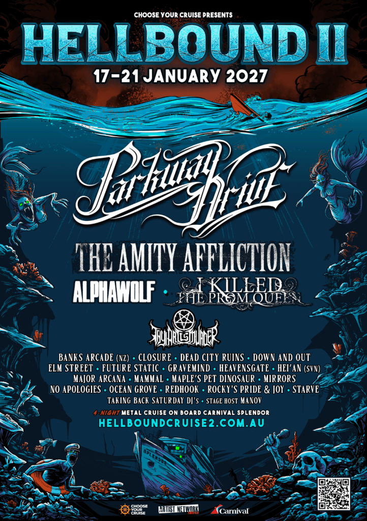 Choose Your Cruise today reveals the full lineup for the much-anticipated January 2027 Hellbound cruise. Global metal heavyweights Parkway Drive will return to headline Hellbound II, alongside metal icons The Amity Affliction, Tassie trailblazers Alpha Wolf, metalcore mainstays I Killed the Prom Queen and deathcore headliners Thy Art Is Murder. This unbelievable combination of heavy hitters will cruise the Carnival Splendour across four nights January 17-21, 2027.