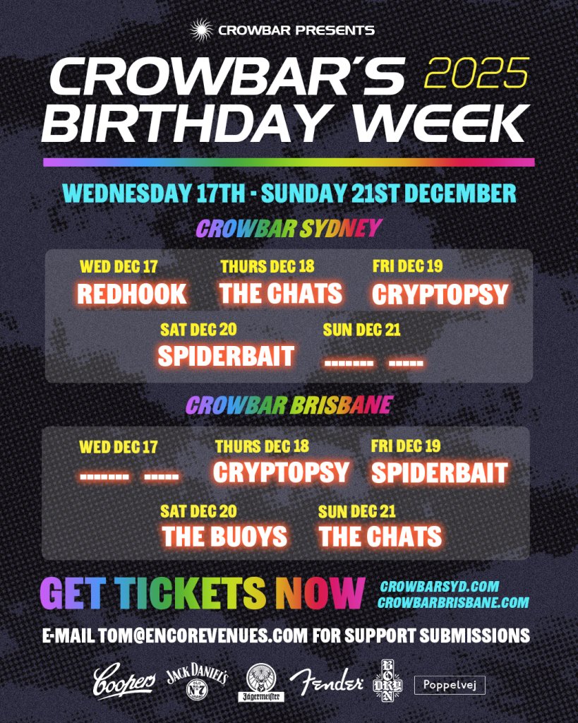 Australia’s iconic live music venue Crowbar is celebrating its 13th birthday in 2025, marking over a decade of blood, sweat and beers since opening in 2012. With thousands of bands through its doors and millions of pints poured, Crowbar will mark the milestone with a week-long party in both Sydney and Brisbane in December.