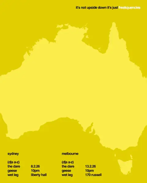 freakquencies is The Dare’s infamous club night: a real “IYKYK” event that helped bring The Dare’s nouveau-bloghouse sound from New York City to the world. But it’s not just Harrison spinning tunes; The Dare always invites some famous friends along for the ride. These exclusive parties in Melbourne and Sydney will be no different: on both nights The Dare will be joined behind the decks by indie darlings Wet Leg (UK) and your favourite new band Geese (US) playing bangers until the lights come on.