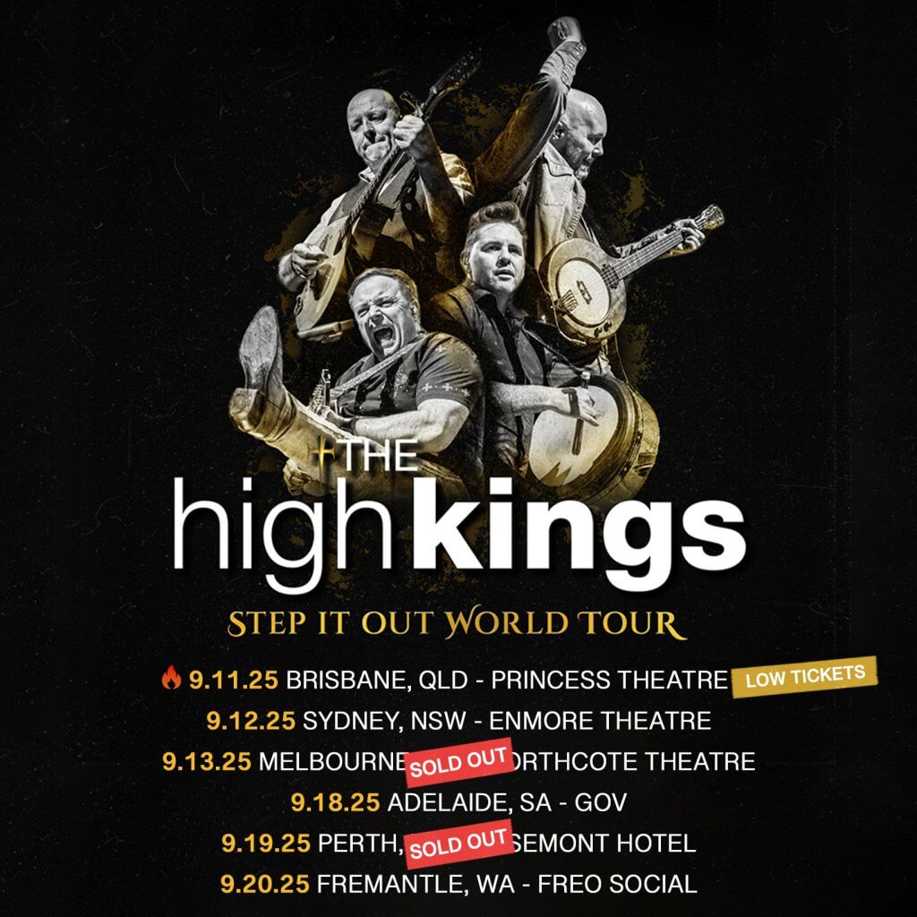 The Step It Out World Tour will visit some of Australia’s most iconic venues, kicking off on Thursday 11 September in Brisbane, before heading to Sydney, Melbourne, Adelaide, Perth and finishing in Fremantle on Saturday 20 September, with the Perth and Melbourne shows already completely sold out, and low ticket warnings in place for Brisbane, tickets for The High Kings’ Step it Out Australian tour are on sale now from metropolistouring.com/the-high-kings-2025/.