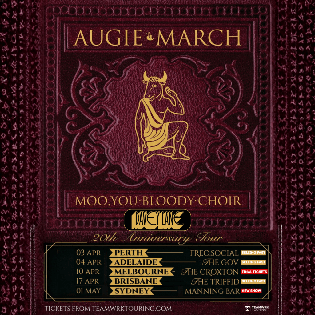 Tickets for Augie March’s 20th Anniversary Tour of Moo, You Bloody Choir are one sale now from http://www.teamwrktouring.com/tours/augie-march-anniversary-tour.