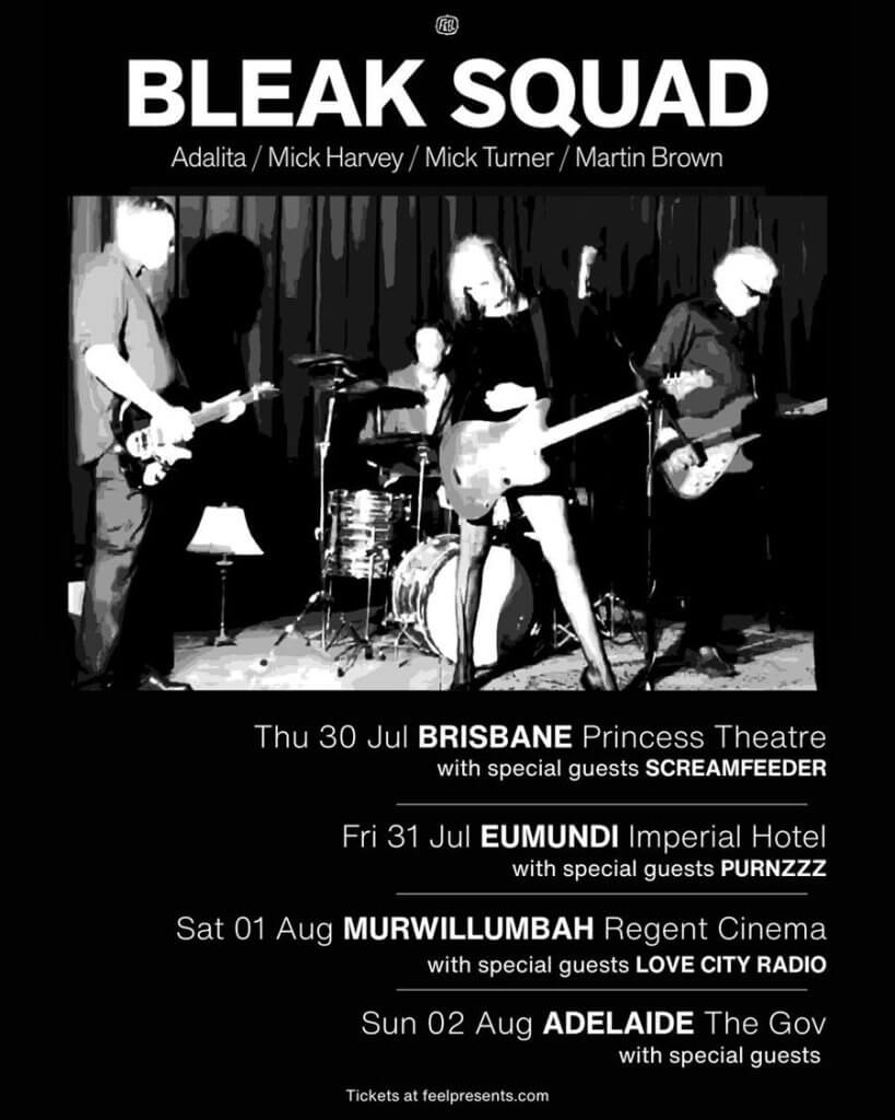 After a busy start to 2026—featuring packed headline shows and a support slot with UK stalwarts Pulp—Bleak Squad the super-natual group featuring members of Dirty Three, Magic Dirt, The Birthday Party & Art of Fighting keep the momentum going into July and August. The run includes dates in Brisbane, Eumundi and Murwillumbah, before wrapping up with their first-ever visit to Adelaide.