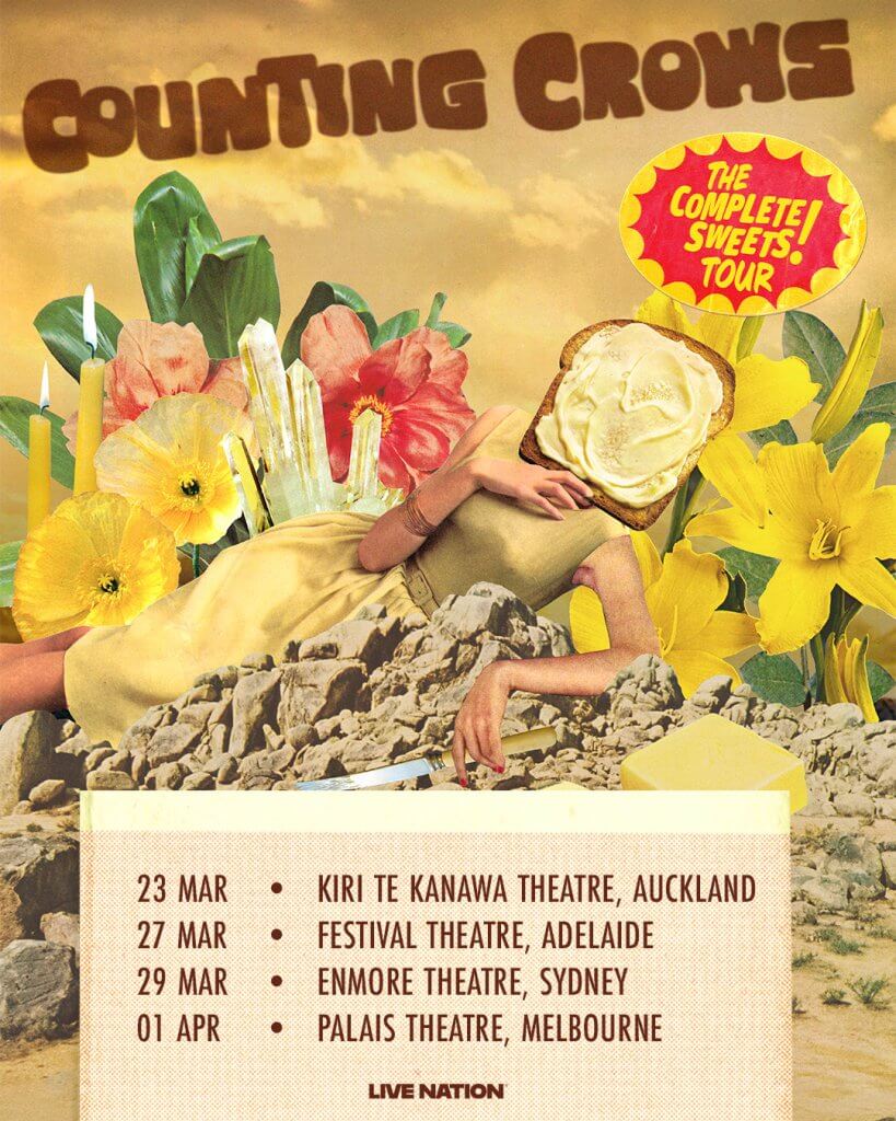 Counting Crows kick off The Complete Sweets! Tour in Auckland at Kiri Te Kanawa Theatre on Monday 23 March, before heading to Australia for a show at Festival Theatre, Adelaide on Friday 27 March, followed by Sydney’s Enmore Theatre on Sunday 29 March and finishing in Melbourne at Palais Theatre on Wednesday 1 April.