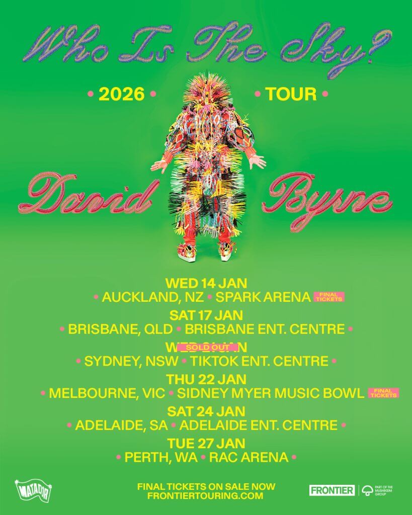 The wait is almost over for David Byrne’s highly anticipated return. Next week, the musician, writer, visual artist, and filmmaker kicks off the 6-date Australia and New Zealand leg of his Who Is The Sky? world tour, with Sydney sold out and final tickets remaining in Auckland and Melbourne.