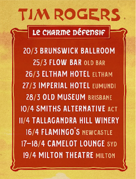Recent Rock ‘N’ Roll Hall of Fame inductee Tim Rogers has announced his Le Charme Defensif tour, a string of intimate solo shows scheduled for March and April next year, with tickets on sale now.